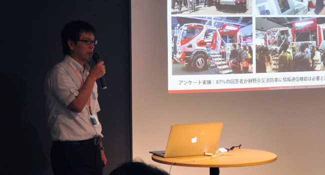 Mr. Hamada gave first an overview of what kind of fire engines there are. He then focused on his design of a fire engine for fighting forest fires. He also went on to talk about the future fire engines. In the future they can be remotely operated through virtual reality helmets and even use alternative methods for putting out fires. One of the examples he presented is a device that puts out fires by reducing oxygen levels around the fire. Remotely controlled fire engines are particularly good for high risk environments such as airports.
