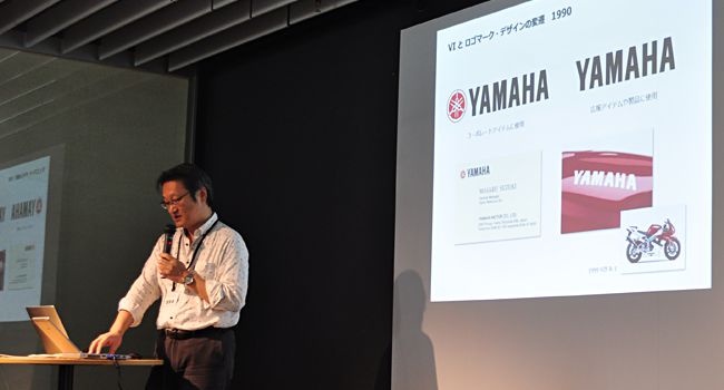 Mr. Inoue from GK Kyoto Inc. gave a presentation about the logomark design of Yamaha. His company has been in charge of the Yamaha logo and maintaining the visual identity now for several decades. He gave a breakdown of the system of how the logo and logomark are used in various products.