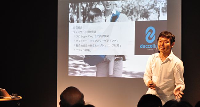 三宅氏は、お父さんが使うことの出来る「だっこヒモ」をどのようにデザインしたかを話しました。このジャンルの商品は、既に多く存在するのですが、彼はよりファッショナブルなモノを作りたかったのです。そして、カバンとしても使用できる様にしたのです。